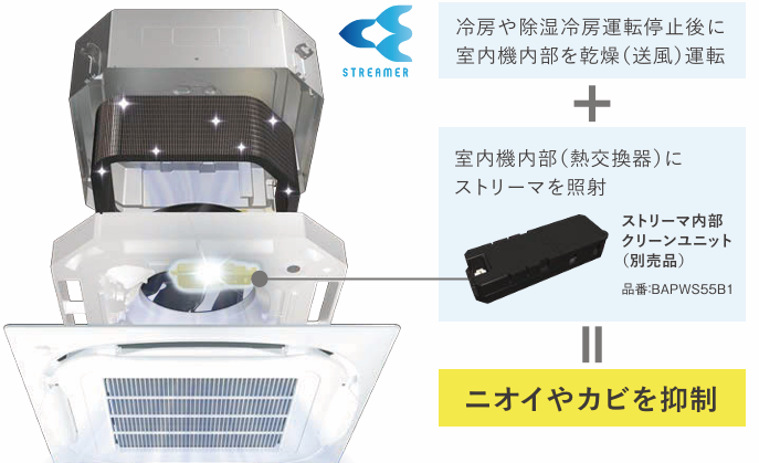冷房や除湿運転停止後にエアコン内部を送風乾燥し、さらに熱交換器にストリーマを照射することで、ニオイの原因となるカビの繁殖を抑制。エアコン内部を清潔に保ち、吹き出す風もキレイにします。